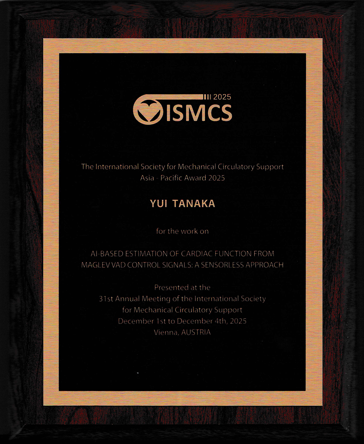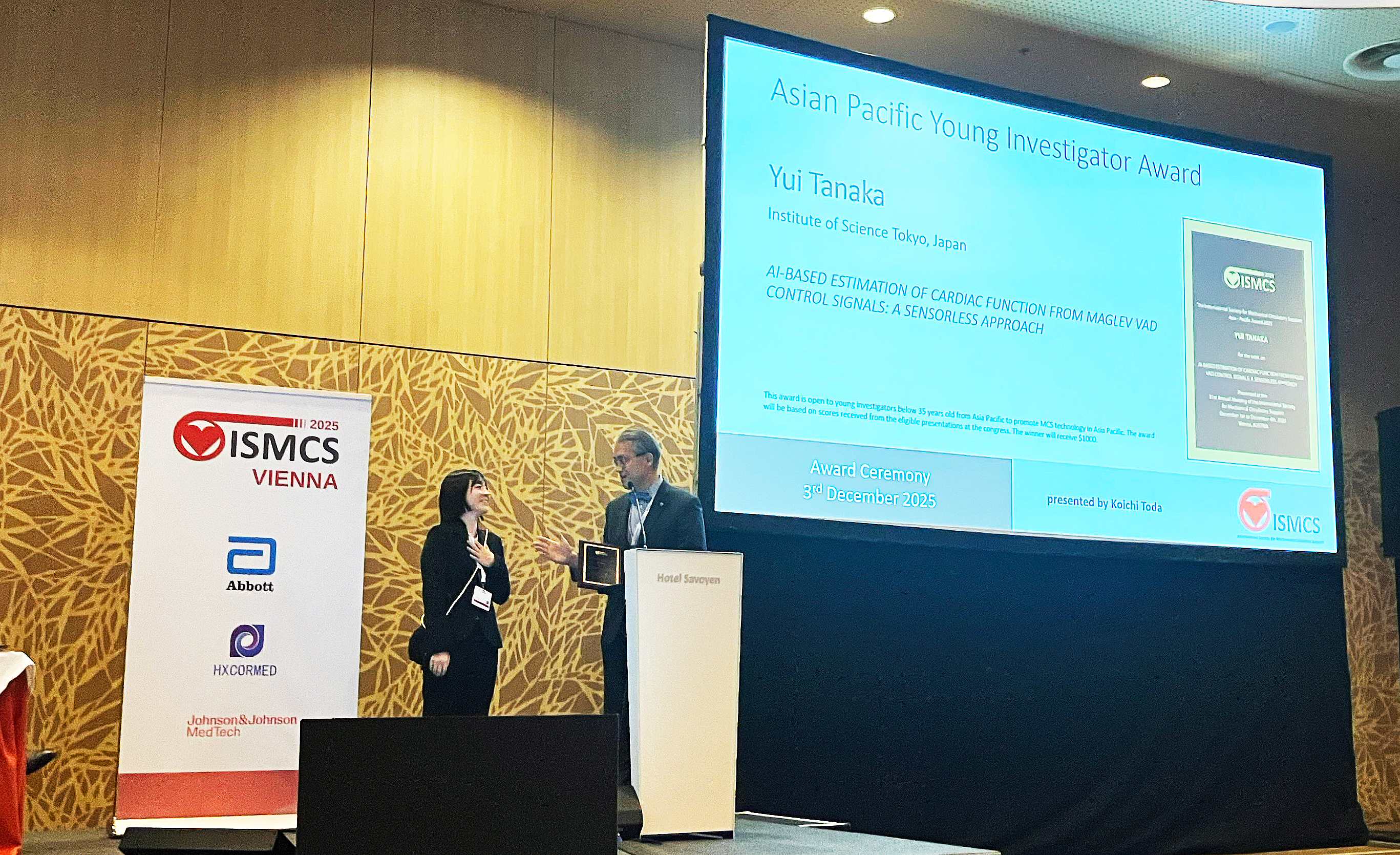 D1の田仲さんが人工心臓と機械学習を統合した心機能評価に関する研究で,ISMCS2025にてAian Pacific Young Investigator Awardを受賞しました.