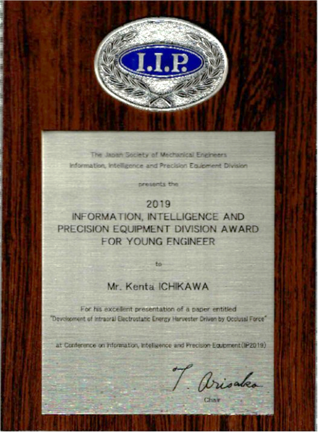 2019年度3月に日本機械学会IIP部門講演会で市川君が発表した講演が、IIP部門賞優秀講演奨励賞に選ばれました。本賞は、IIP部門が企画主催した2019年1月~12月の全講演の中から評価されたものが選出されます.